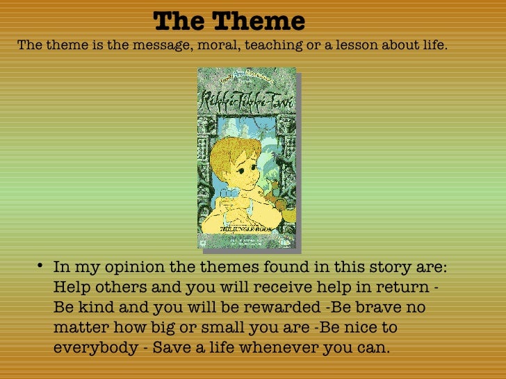 Courage a story can have more than one theme. One theme from rikki tikki tavi would be courage. Rikki has to fight two cobras, nag and nagaina, to protect his garden and teddy. He is frightened of them because they are stronger and bigger than he is, but he overcomes his fear and fights them anyway.