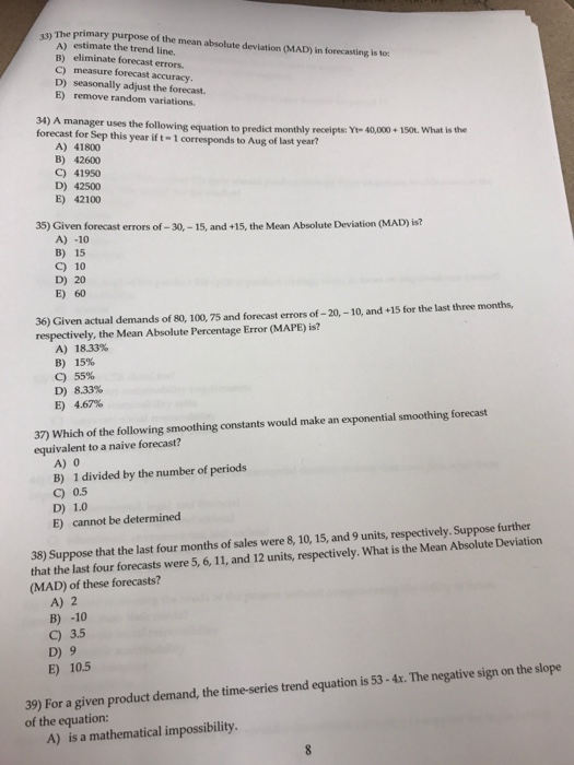 The primary purpose of the mean absolute deviation (mad) in forecasting is to: A) estimate the trend line. B) eliminate forecast errors. C) measure forecast accuracy. 32) the primary purpose of the mean absolute deviation (mad) in forecasting is to: A) estimate the trend line. B) eliminate forecast errors. C) measure forecast accuracy. D) seasonally adjust the forecast.