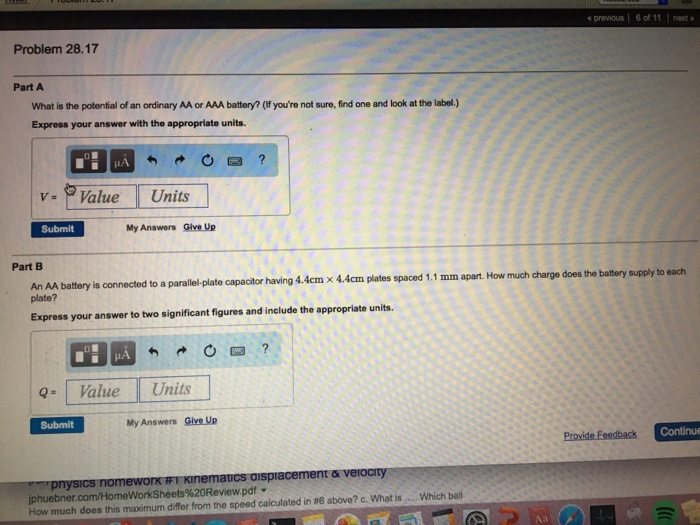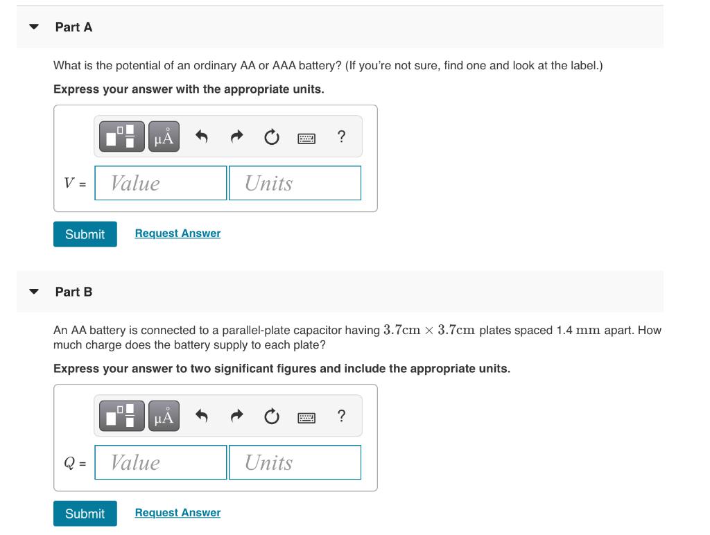 What is the potential of an ordinary aa or aaa battery? (if you're not sure, find one and look at the label. ) express your answer with the appropriate units. An aa battery is connected to a parallel plate capacitor having 4. 4cm times 4. 4 cm plates spaced 1. 1 mm apart. What is the potential of an ordinary aa or aaa battery (if you re not sure, find one and look at the label express your answer with the appropriate units. Part a what is the potential of an ordinary aa or aaa battery? We are given this situation, andy. A battery is connected to a parallel plate capacitor, and then the capacitor is made up off to secular plates, retirement for equals to force them. And then the spacing between the plates. So there are two parts in this question are partly, um, yeah.