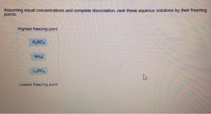 Show transcribed metaphor text rank these aqueous separations from last playingzing top to first playingzing top. 0. 40 m c2h602 ii. 0. 20 m na3po4 iii. 0. 30 m kno3 iv. 0. 20 m c6h1206 o || rank these aqueous separations from last playingzing top to first playingzing top. 0. 40 m c2h602 ii. 0. 20 m na3po4 iii. Chemistry questions and answers. Rank these aqueous solutions from lowest freezing point to highest freezing point.