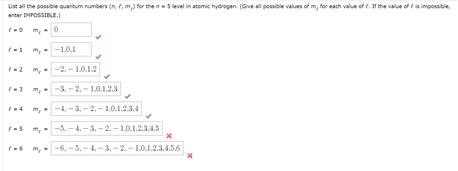 0 , 1, 2, 3, 4. How many liters of o2 gas, measured at 781 mmhg and 24 ∘c , are required to completely react with 2. 7 mol of al ? And so with m l being 3, well there's constraints on what m l can be and if l was 3, m l can be starting at negative whatever l is so negative 3 and then increasing by 1's so negative 2, negative 1, 0 and 1, 2 up to a maximum of l which is 3 so hypothetically, if l was 3, that would allow an m l. So we give them the values for the quantum numbers n and l of a sub shell off five and three, respectively, on were asked to work out the possible values off the quantum numbers.